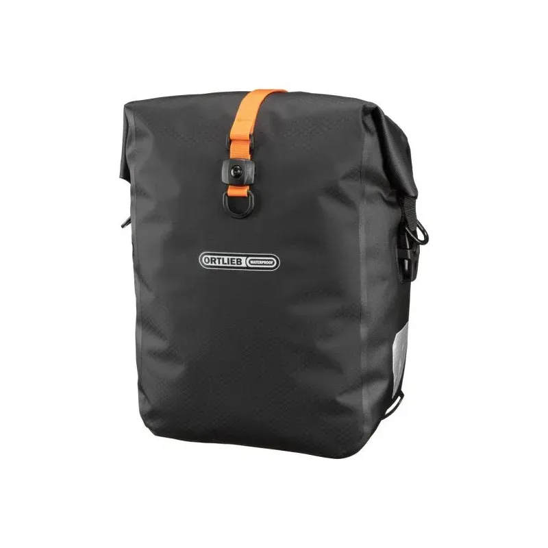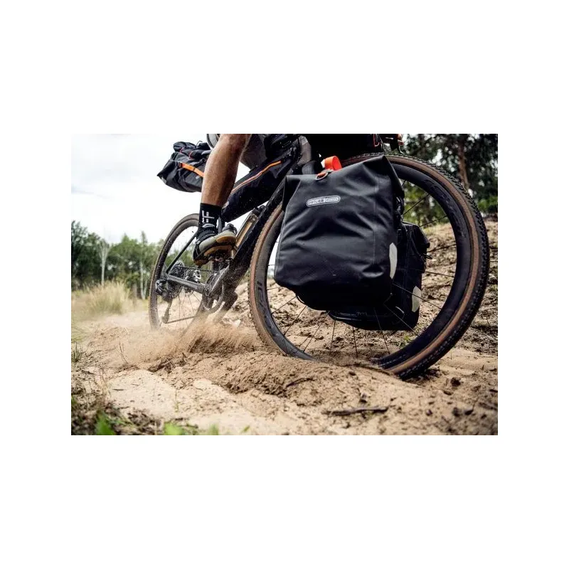 Gracias a la ausencia de bolsas interiores y al empleo de una placa para el hombre en el asa para llevar, el peso de las bolsas es muy bajo. A la vez, el material ligero y resistente a la abrasión resiste incluso a las condiciones más duras de pistas de piedra y de grava. Ni siquiera el peor tiempo podrá afectar tu equipaje dado que las bolsas herméticas al agua están dotadas del probado cierre enrollable de ORTLIEB. Gracias al sistema Quick-Lock2.1 y el gancho doble de enclavamiento, el Gravel Pack se encuentra sujetado de manera segura y libre de sacudidas en el portaequipajes, mientras que tu disfrutas con el Gravel-Grinder, el Mountain-Bike o el Fatbike de un viaje de descubrimiento.