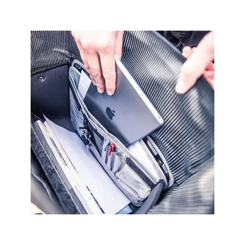 Gracias al cierre enrollable comprimible y los cierres encajables laterales es posible guardar todo en forma segura y sin moverse de un lado a otro, permitiendo, no obstante, un acceso rápido.