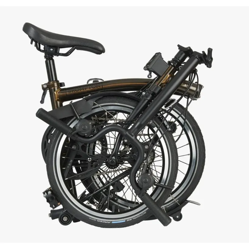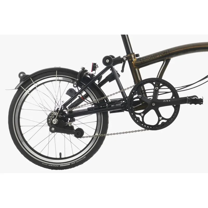 Rueda trasera: Llanta de doble pared, 28 radios, buje interno de 3 velocidades Brompton Wide con un sistema de marchas externo de 2 velocidades (13 y 16 dientes).