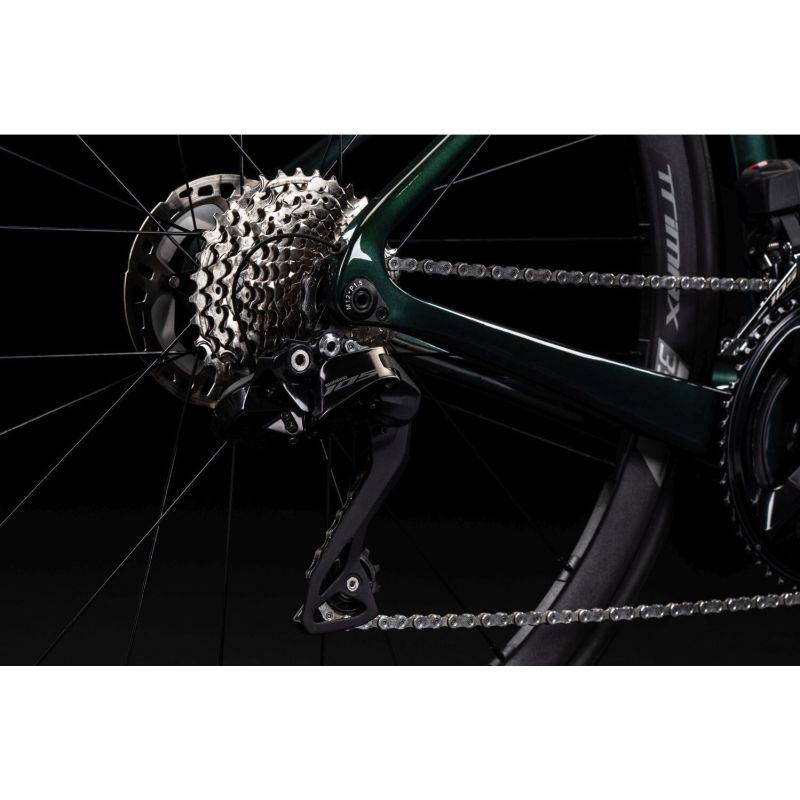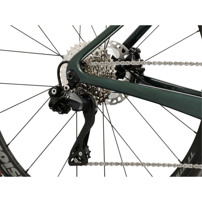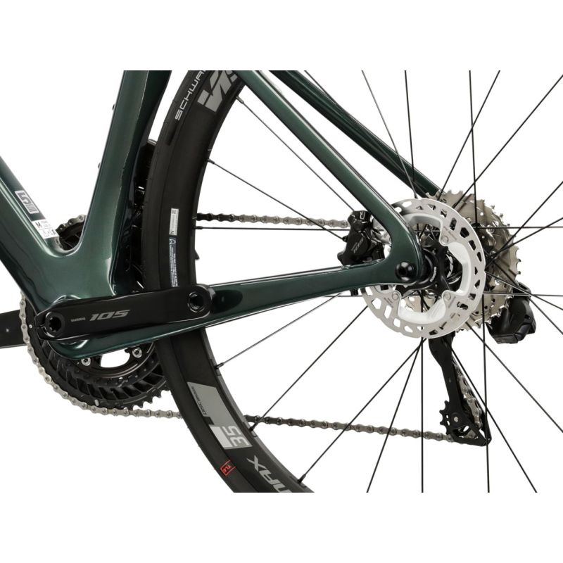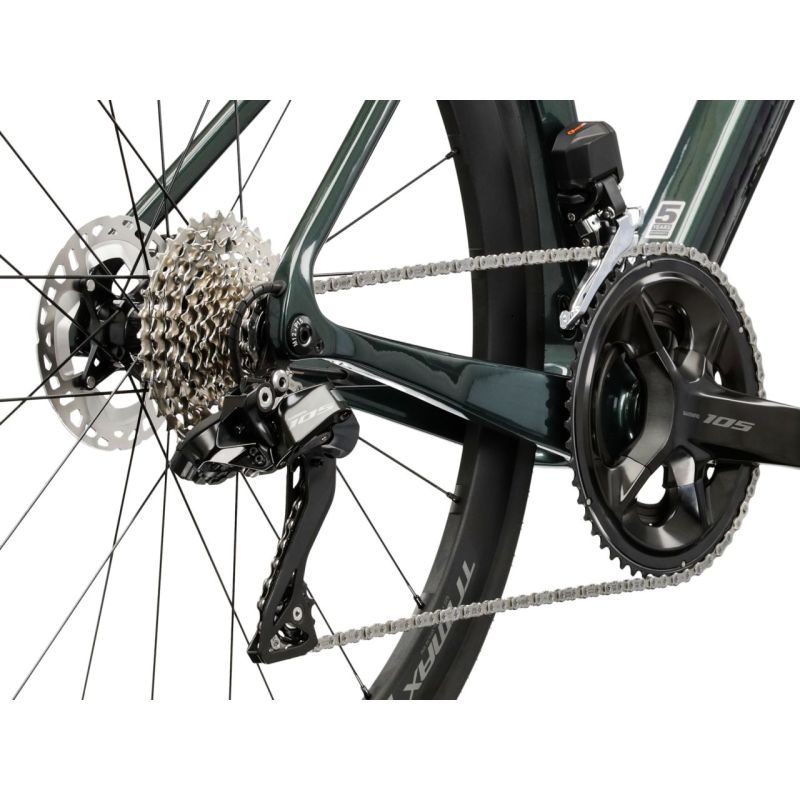 Esta bicicleta equipa el grupo Shimano 105 Di2 con transmisión electrónica inalámbrica 2x12. Los cambios son rápidos y precisos, tanto en llanos como en ascensos exigentes, gracias a la combinación de platos 36-52 y cassette 11-36T. Una solución perfecta para mantener la cadencia óptima en cualquier terreno.
