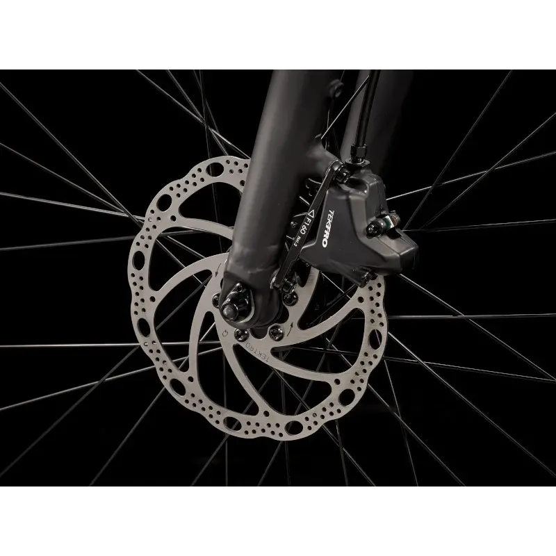 Cuadro ligero de aluminio con diseño stagger para subir y bajar de la bicicleta más fácilmente, sistema de asistencia al pedaleo desarrollado y patentado por Trek con motor en el buje (250 W, 40 Nm) que ofrece una asistencia de hasta 25 km/h y una batería de 250 Wh para disfrutar de una autonomía de hasta 55 kilómetros por carga. Además, incorpora ruedas rígidas de 650b y cubiertas anchas de 50c que aportan capacidad y confort sobre distintos terrenos, una fiable transmisión Shimano de 9 velocidades, frenos de disco hidráulico, luces integradas alimentadas mediante la batería y una pata de cabra.