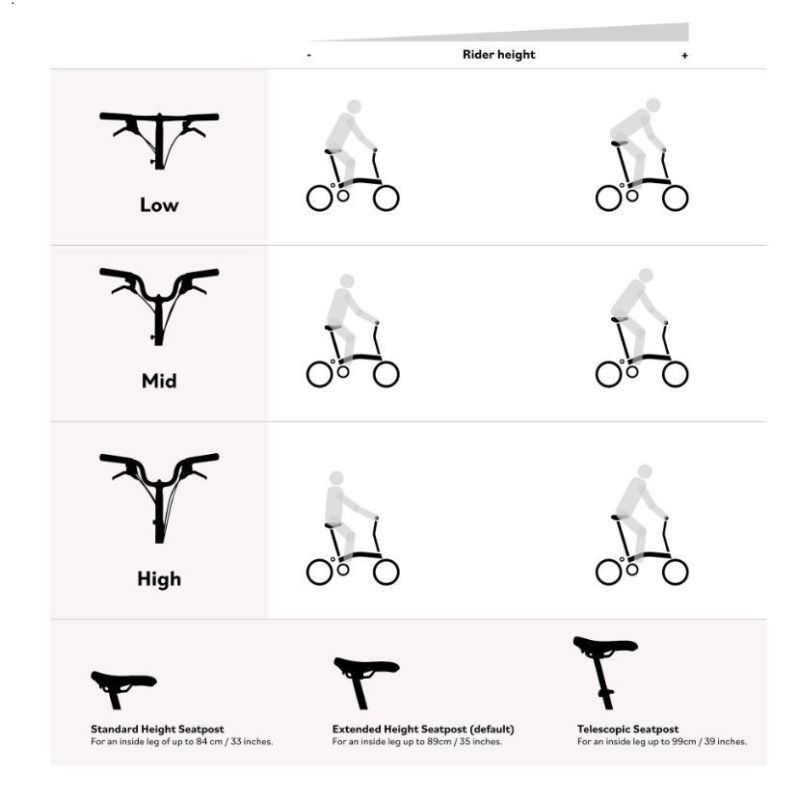 Tija de sillín: Tubo de acero al cromo molibdeno Brompton Extended. Para una pierna interior de 35"/89 cm como máximo