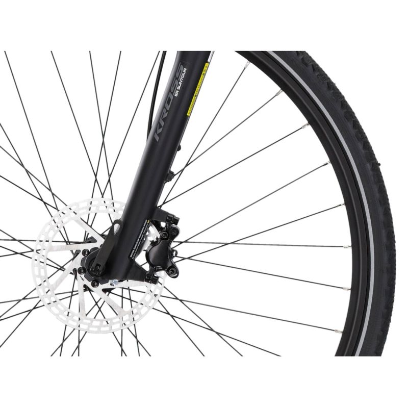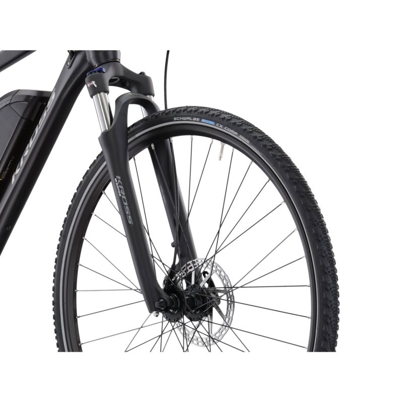 El cuadro KROSS Evado Hybrid 1.0 está fabricado en aluminio 6061. Esta aleación especial de aluminio hace que la bicicleta sea rígida y resistente a las roturas. Al mismo tiempo, es un material relativamente ligero que puede sorprender a muchos ciclistas por sus propiedades. El marco está recubierto de polvo, lo que se traduce en durabilidad de la pintura y resistencia de la pintura a daños mecánicos.