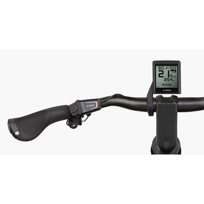 El cockpit opcional está perfectamente integrado en el manillar y destaca por un guiado de cables limpio y ordenado. El generoso display Kiox 300 es su compañero de viaje inteligente tanto para los desplazamientos diarios como para salidas más exigentes, con los datos de ruta y datos de fitness siempre a la vista. Gracias a la potencia regulable, la posición de conducción se puede ajustar de más confortable a más deportiva según sus preferencias del momento. El display Intuvia 100 de serie sin cockpit presenta los datos de velocidad, autonomía y muchos otros parámetros de forma clara y ordenada. Para ambos displays, la selección del modo de conducción se realiza cómodamente a través de LED Remote, que señaliza el modo seleccionado mediante colores.