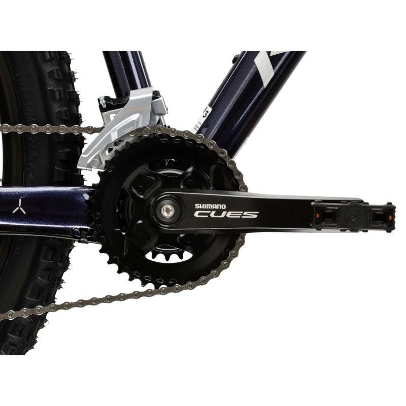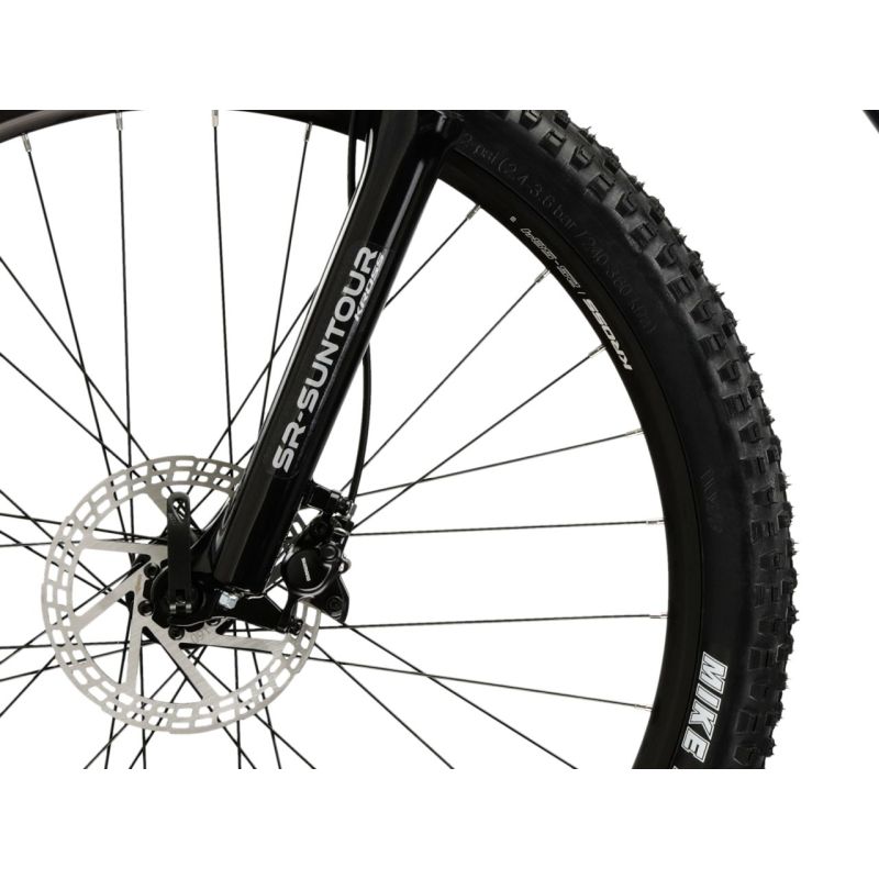 La horquilla SR Suntour XCM con 100 mm de recorrido y bloqueo en el manillar absorbe los impactos y permite mantener la eficiencia de pedaleo cuando se activa el bloqueo. La transmisión Shimano de 2x9 velocidades ofrece un rango útil para subidas y llanos; los mandos y la mecánica están pensados para ofrecer respuestas precisas incluso con mantenimiento básico. Los frenos hidráulicos Shimano MT200 con discos de 160 mm proporcionan una frenada consistente y modulable, imprescindible para circular con seguridad con tráfico o en condiciones húmedas.