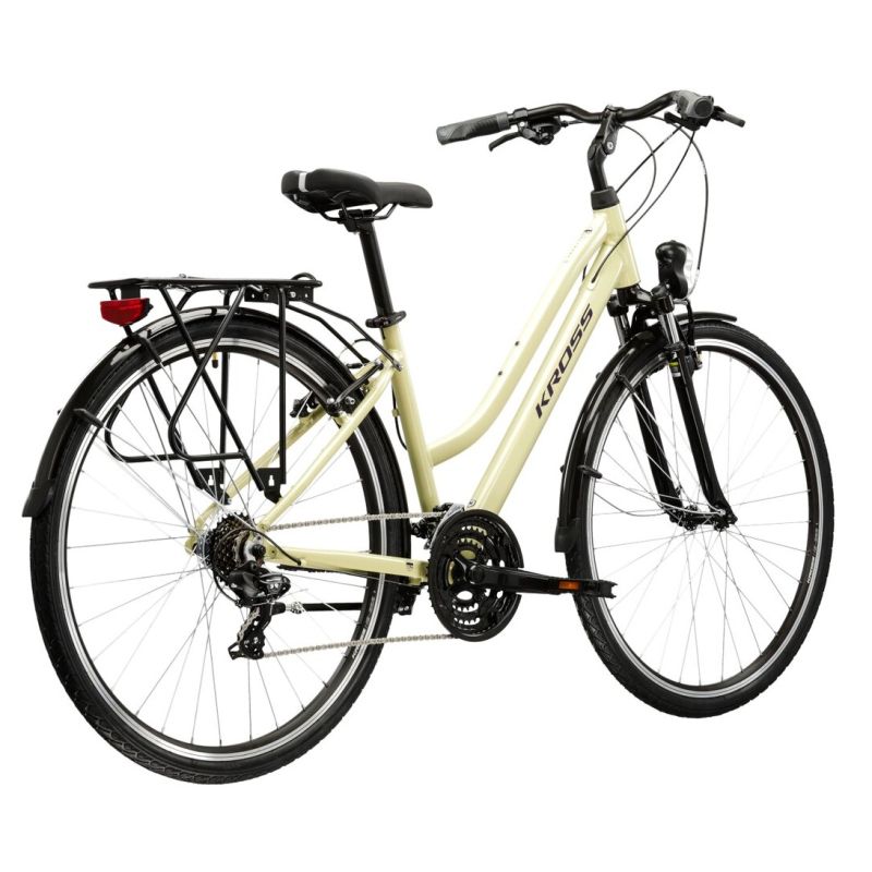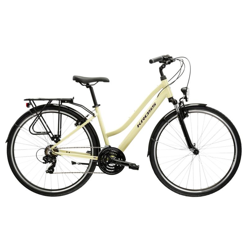 KROSS Trans 1.0 Mujer (2025): trekking cómoda y práctica para ciudad y vías verdes. Cuadro de aluminio 6061 con horquilla de 30 mm, transmisión Shimano 3x7 (21v) y frenos V-Brake de mantenimiento sencillo. Viene con portabultos, guardabarros e iluminación integrada para tu día a día.