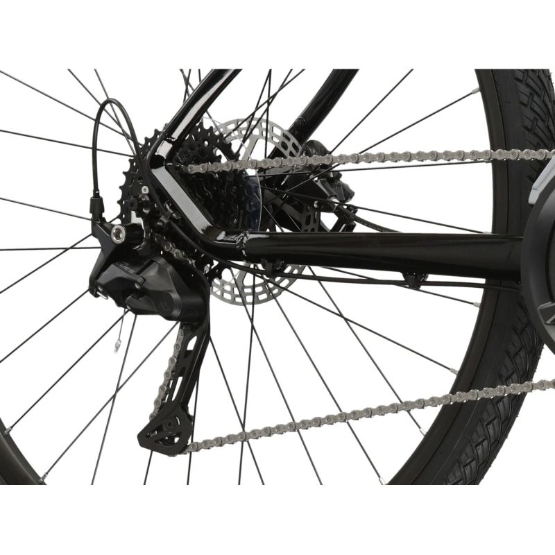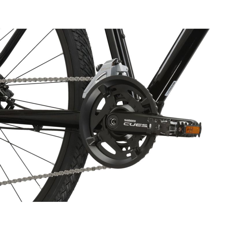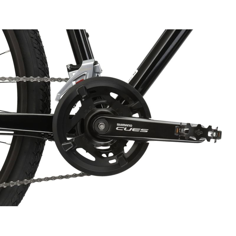 Equipada con transmisión Shimano CUES de 18 velocidades y frenos de disco hidráulicos MT200, garantiza una conducción suave, segura y eficiente. La horquilla SR Suntour NEX HLO con bloqueo hidráulico y 63 mm de recorrido añade confort y control en todo tipo de terreno.