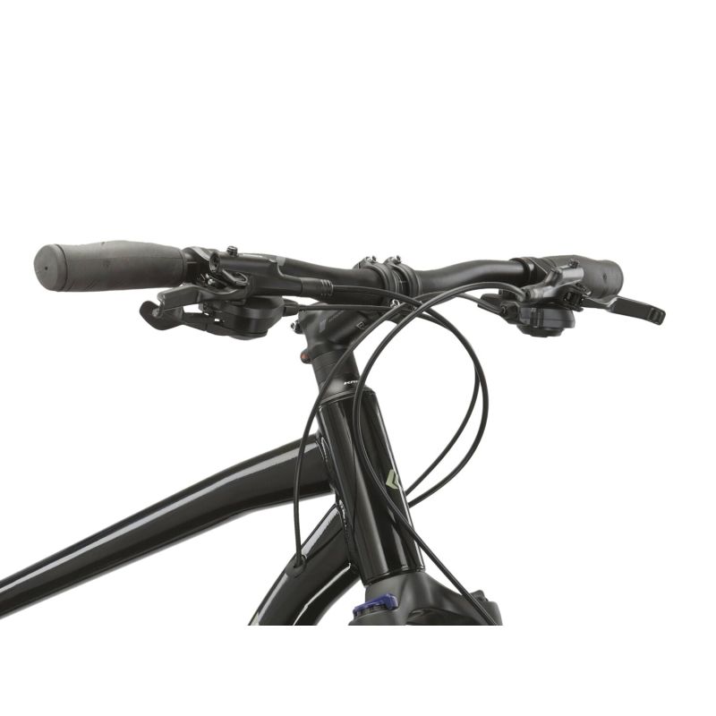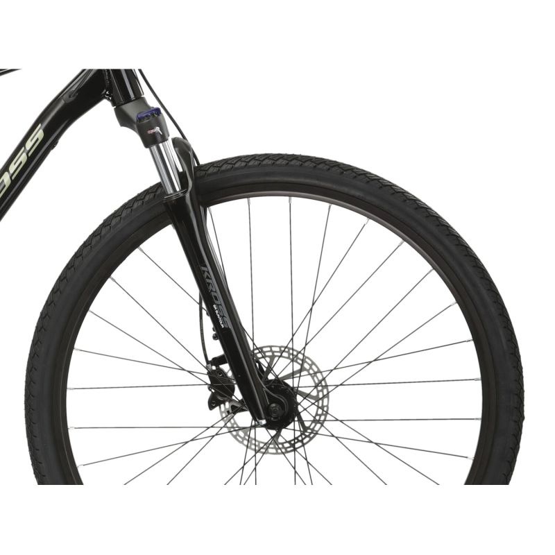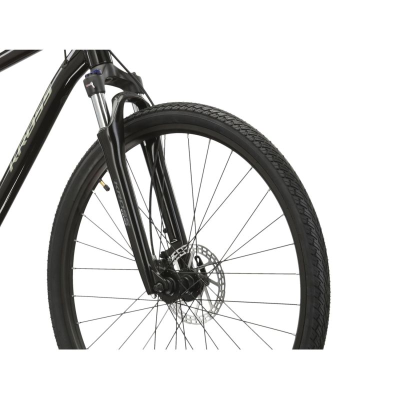 La horquilla SR Suntour NEX HLO con 63 mm de recorrido y bloqueo hidráulico ofrece una absorción eficaz en adoquines o caminos de grava. Junto al sillín KROSS, la tija de 31,6 mm y los puños Hermans Oxi, proporciona una posición ergonómica para trayectos largos.