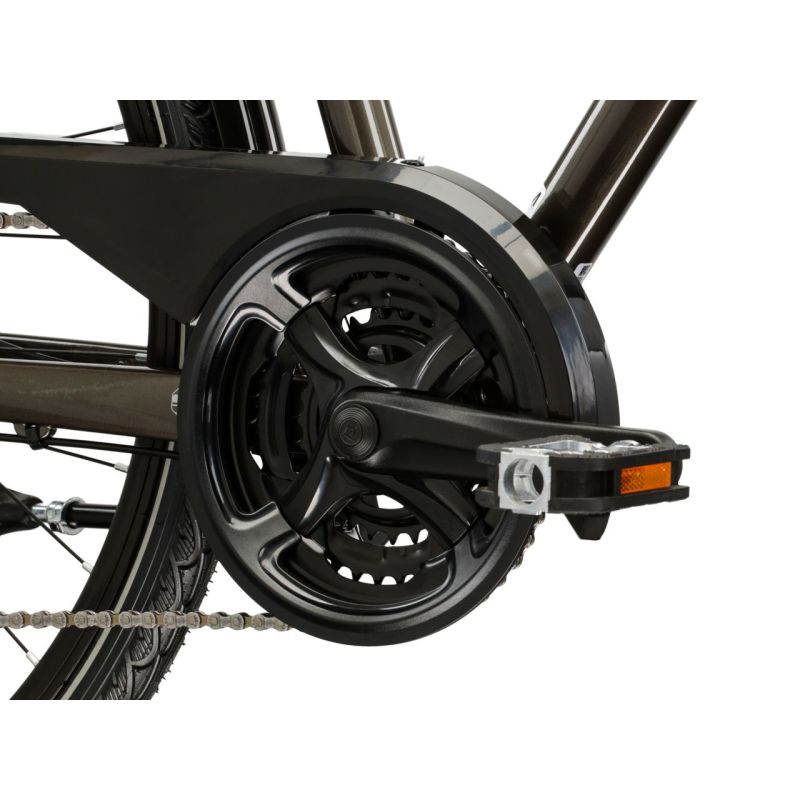 Su transmisión Shimano 3x8 (24 velocidades) combina Tourney TY601 delante y Acera M3020 detrás para cambios suaves y fiables, tanto en cuestas como en llano. Los frenos de disco hidráulicos Shimano MT200 con discos de 160 mm aseguran potencia y modulación incluso con lluvia.