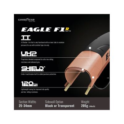El Eagle F1 R, parte de la gama Road UHP (Ultra High-Performance), desarrollada en los más altos niveles del ciclismo deportivo, es el neumático de referencia para corredores y entusiastas que buscan una baja resistencia a la rodadura sin comprometer un agarre equilibrado en seco y mojado.