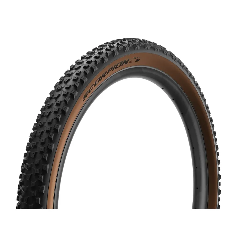 En su elegante acabado negro/marrón, la Scorpion XC M demuestra el compromiso de Pirelli con la innovación y el rendimiento en cada pedalada.