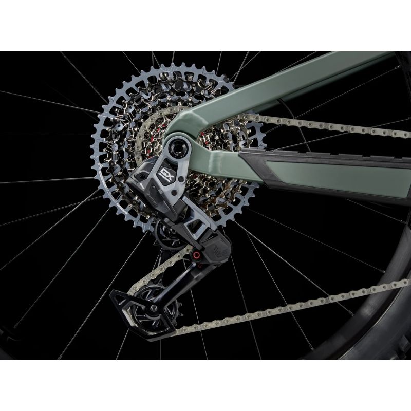 La combinación de suspensión FOX y ruedas Bontrager proporciona una absorción efectiva de impactos provocados por raíces, piedras y secciones rotas del terreno. Esto permite mantener la tracción y mejorar la estabilidad incluso en tramos complicados. Además, el sistema de transmisión electrónica SRAM GX Eagle AXS garantiza cambios rápidos y precisos sin cables, ofreciendo una experiencia de conducción más limpia y fiable.