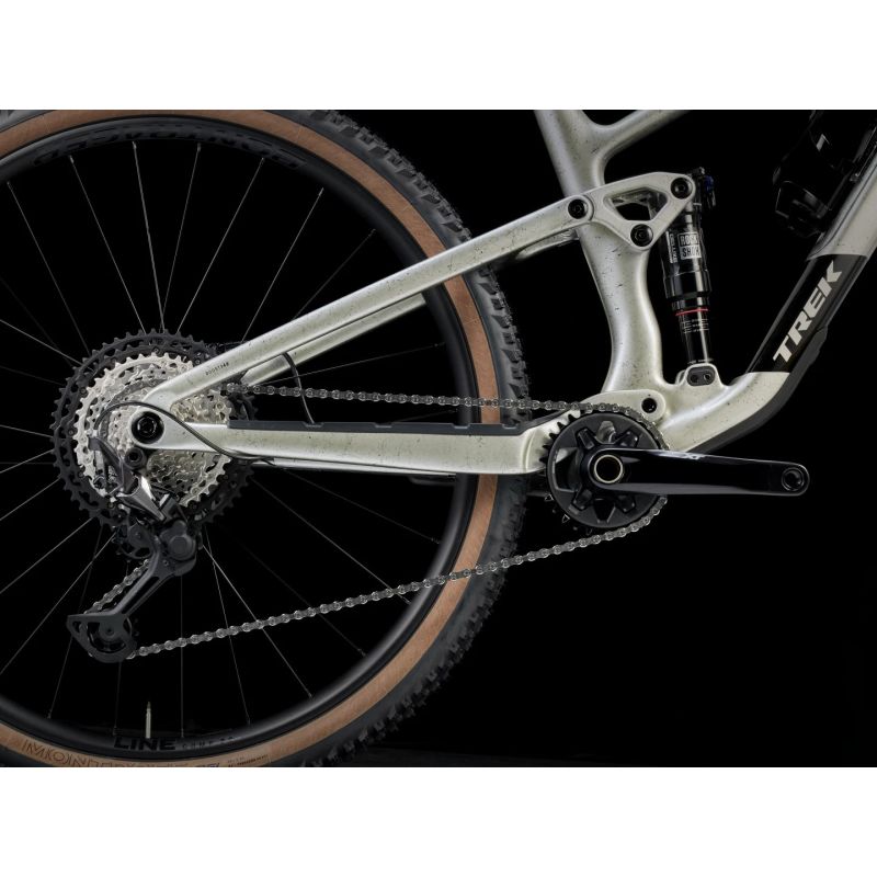 Un cuadro de carbono OCLV Mountain con un soporte de amortiguador inferior Mino Link de 4 posiciones para retocar la geometría y la progresión de la suspensión. Una horquilla RockShox Pike Select+ de 130 mm, con cámara de aire DebonAir y pistón Charger 3.1 RC2, además del recorrido trasero de 120 mm de un amortiguador RockShox Deluxe Ultimate RCT. Una transmisión Shimano XT de 12 velocidades, frenos de disco hidráulicos Shimano XT de 4 pistones, tija telescópica Bontrager Line y ruedas Bontrager Line Comp 30 tubeless ready.