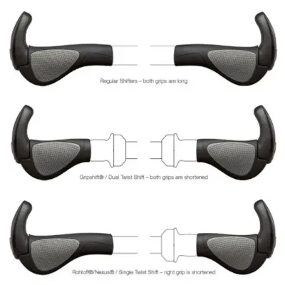 Algunos modelos de nuestra serie GP, incluido el GP1, están disponibles en versiones especiales para diferentes tipos de cambio. Para un cambio regular, ambos puños tienen la misma longitud. La versión para cambios Gripshift® o Dual-Twist-Shift con empuñadura giratoria, incluye dos empuñaduras acortadas; para Rohloff®, Nexus® y Single-Twist-Shift solo se acorta la empuñadura del lado derecho.