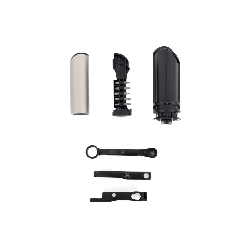 El Brompton Toolkit para T Line es un sistema de herramientas compacto desarrollado por Brompton para integrarse perfectamente en el interior del cuadro de la T Line. Su diseño responde a la filosofía de la marca británica: funcionalidad inteligente, ligereza estructural y aprovechamiento máximo del espacio. Gracias a esta integración, el ciclista puede transportar un kit completo de reparación sin necesidad de bolsas externas ni accesorios adicionales.