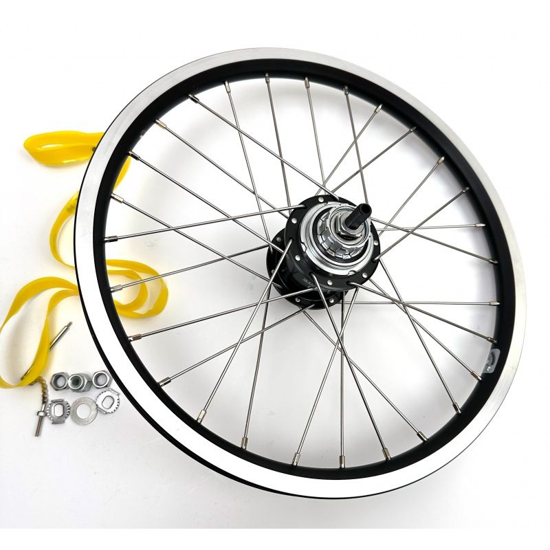 La versión 2025 incorpora radios plateados y un acabado negro con superficie de frenado plateada. Incluye cinta de llanta, cadena indicadora de cambio y fijaciones. Compatible con ruedas de 16” (ETRTO 349) y con válvula tipo Schrader de 8 mm. Un repuesto oficial ideal para mantener tu Brompton con su configuración original de 3 o 6 marchas.
