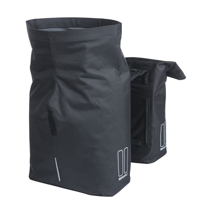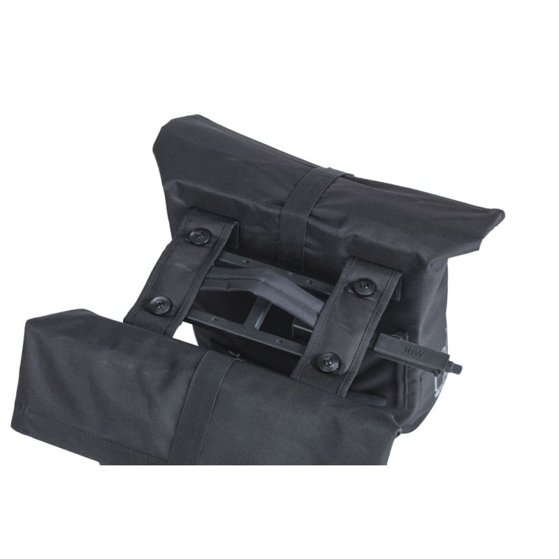 La bolsa Basil Urban Dry Double es una alforja doble de lona negra mate. Incorpora una placa adaptadora MIK premontada para facilitar su fijación al portaequipajes.